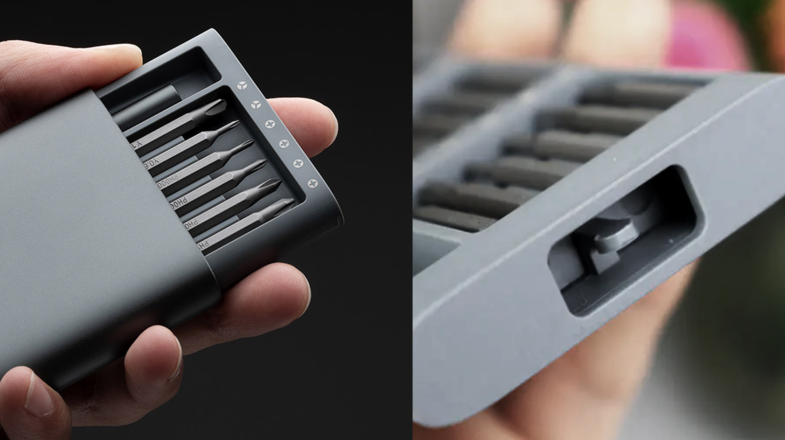 上图小米螺丝批套装的开合方式:一按打开,再一按锁住,简洁、易用