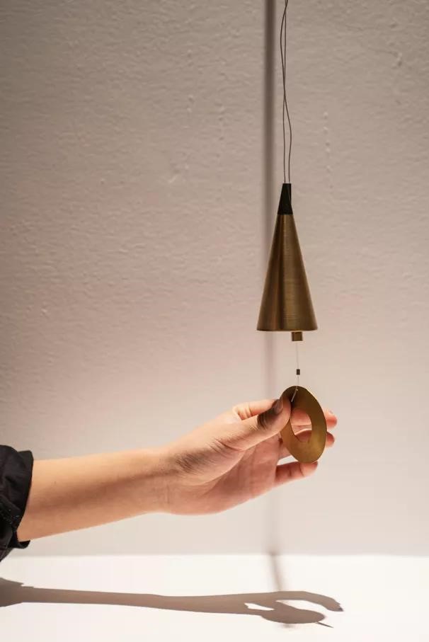 当微风吹过或人去摇动风铃时,落地灯上的两片玻璃开始转动,落日余晖和树影也就摇曳在墙面上了。