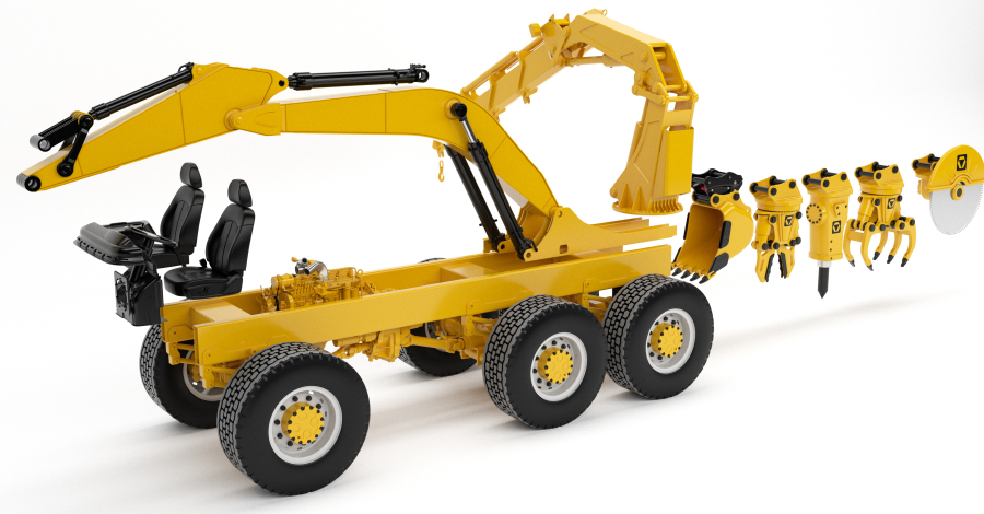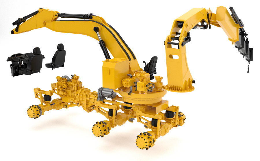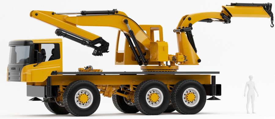 不过做到这里我不太确定接下去要干嘛,想着,要不把车辆的工作部件放上去看看。所以我就把挖掘机部分和小吊臂还有五种工作头都放了上去。