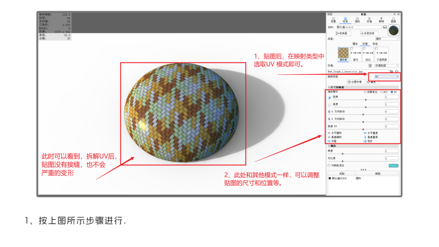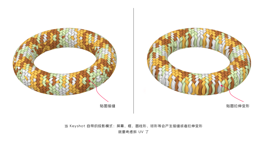 当我们渲染赋予模型贴图的时候,用 Keyshot 自带的几种贴图投影模式都会产生接缝或者拉伸变形,那就是需要拆 UV 了。