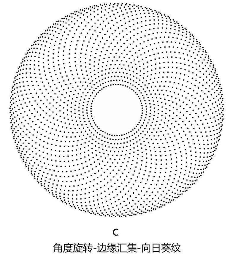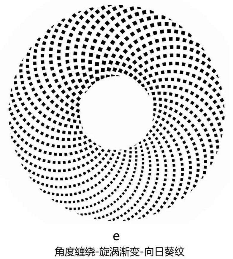 以经典的向“日葵扩散纹”为例,其视觉形象为慢慢向外扩散,由大到小,内含向日葵数列数理,如图6所示。此纹理目前使用最为广泛,其特点在于理性排列并不失动感。就此图案蕴含何种道理,下面进行深度分析,发现多个规律,最终总结为一套设计法则。