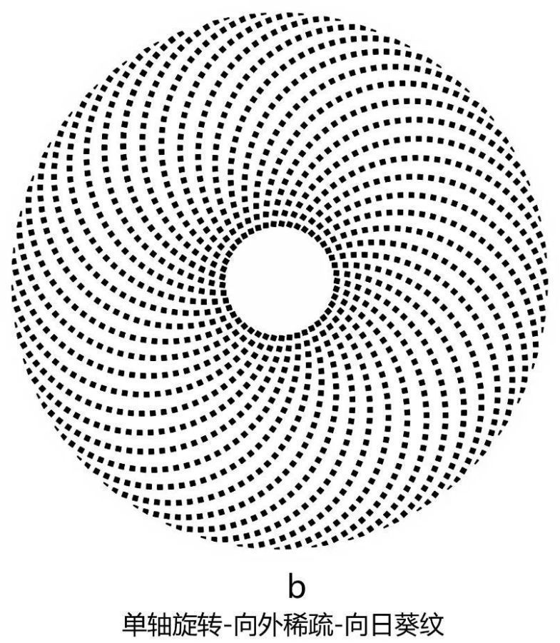 以上将混乱问题细化拆解后,得到设计解决方法。掌握以上设计流程和原理后,基于“向日葵”识别不变的前提下,去改变韵律和规律便形成以下图案,同是“向日葵”基本数理(基础图案),仍可延伸为变异为多种向日葵纹。如图17中a所示,双轴旋转指规律和排列路径,向内密集指差异识别印象,向日葵纹指原始基础图案。图案的命名根据上述描述而来。
