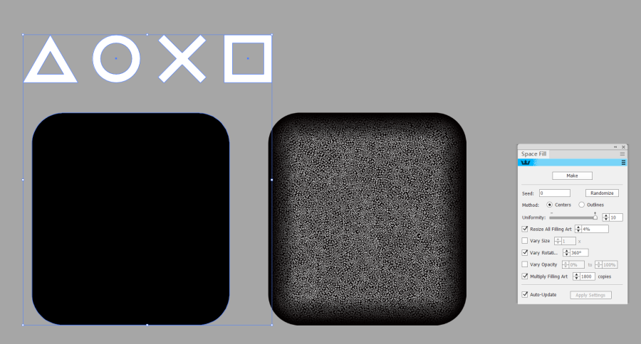 把轮廓线按同等比例导入到 Adobe Illustrator 中,用 Astute Graphics 插件里的 Spcae Fill 填充工具把△、〇、×、□的矢量图形,随机填充到圆角矩形之中,(设置好参数以后,把图形打组,加选圆角矩形,点击“make”随机填充)在周围做黑色透明渐变(因为要做边缘弱化的处理),导出的时候选择X4,这样贴图会更高清!