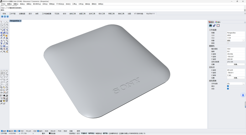 首先我们在犀牛里制作一个带有凹刻LOGO的圆角矩形模型,其四周可以是平面也可以是曲面,这里我用带有曲面的“蛋壳面”造型。接着提取圆角矩形外轮廓,并且把logo的面单独提取,这是我们制作贴图和渲染的准备工作。
