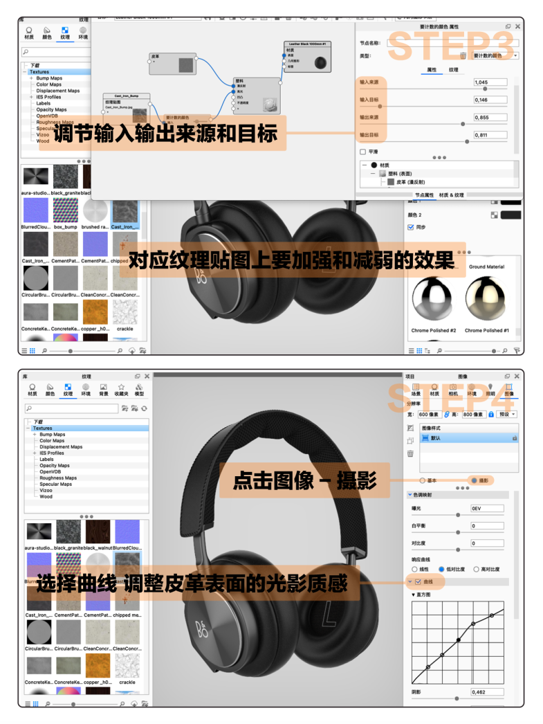 🟠 首先在keyshot里调节照明模式,选择产品照明模式,确保全局光照打开(确保皮革纹理的细节亮度充足),然后找到材质皮革/leather,贴完皮革基础材质之后,找到纹理贴图里面的CASTIRON材质贴图,将贴图连接至高光,右键单击连接曲线点击要计数的颜色,然后根据需求调节纹理贴图的输入输出的来源和目标。最后点击图像-摄影,调节曲线增强绿皮革表面的纹理和质感。