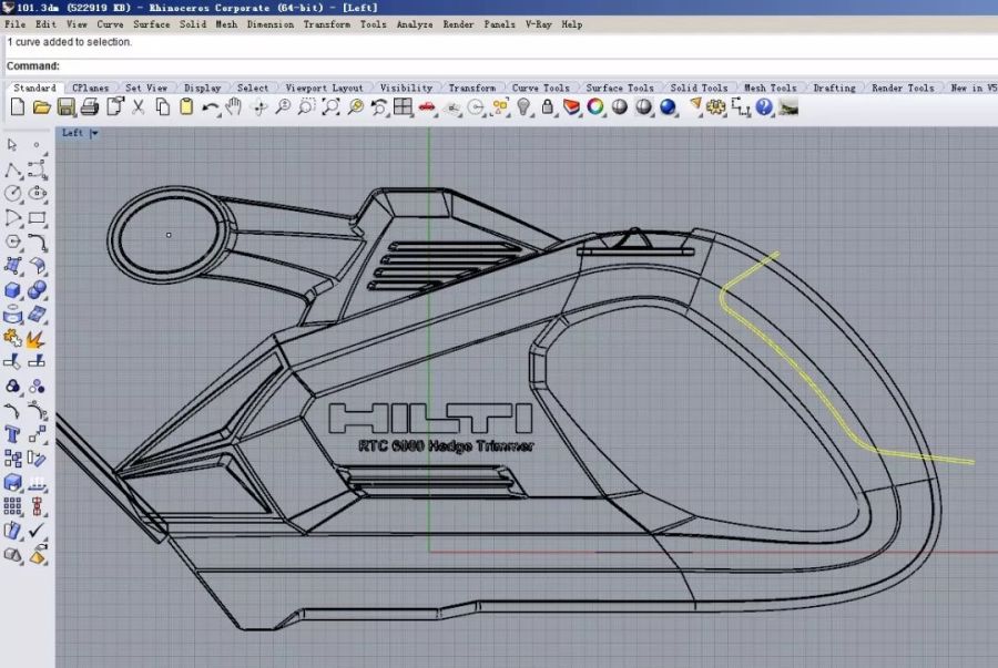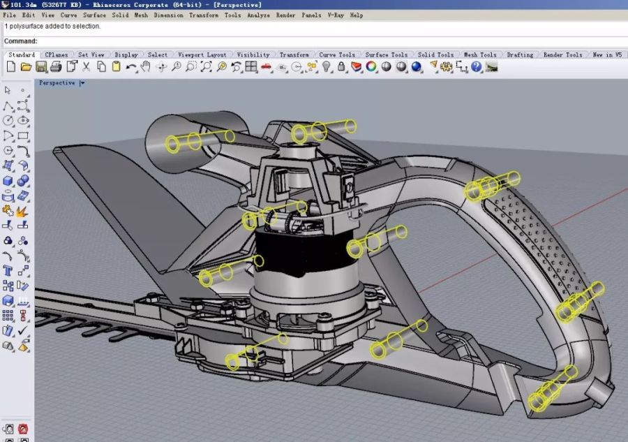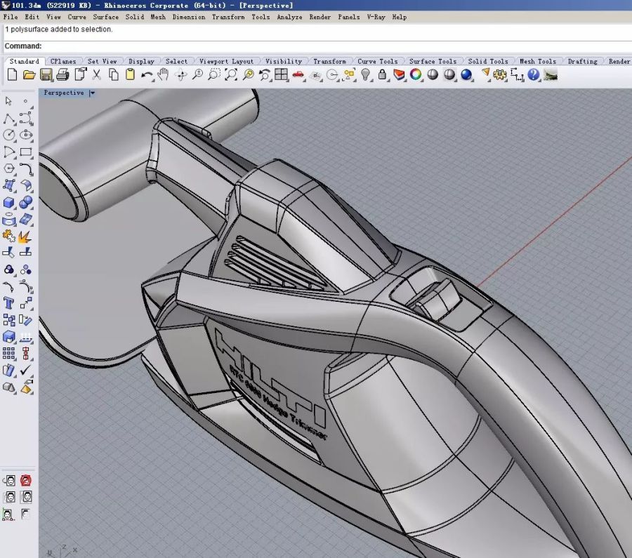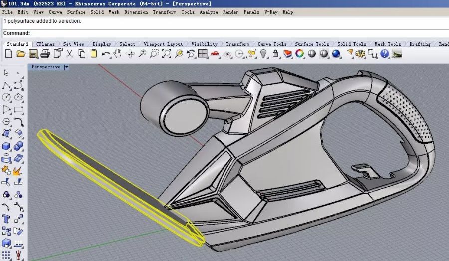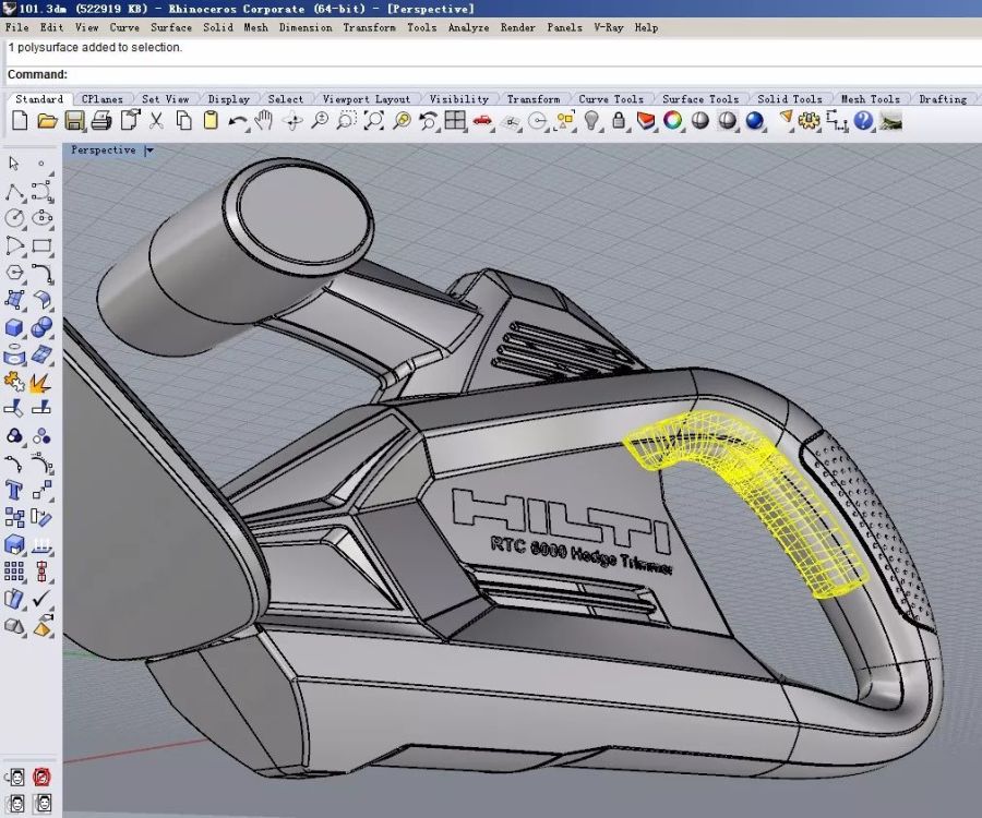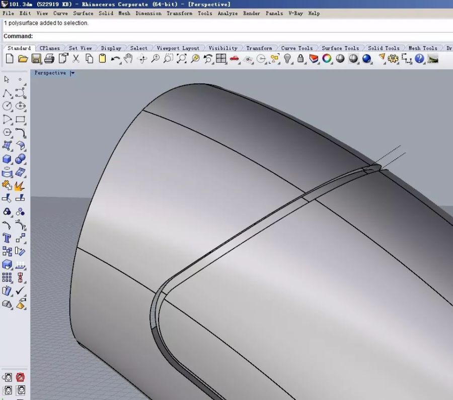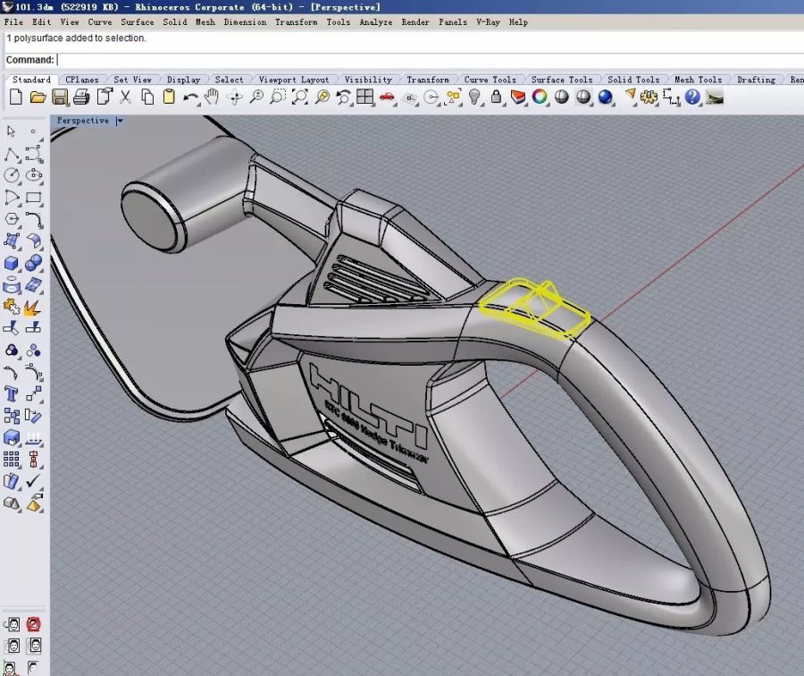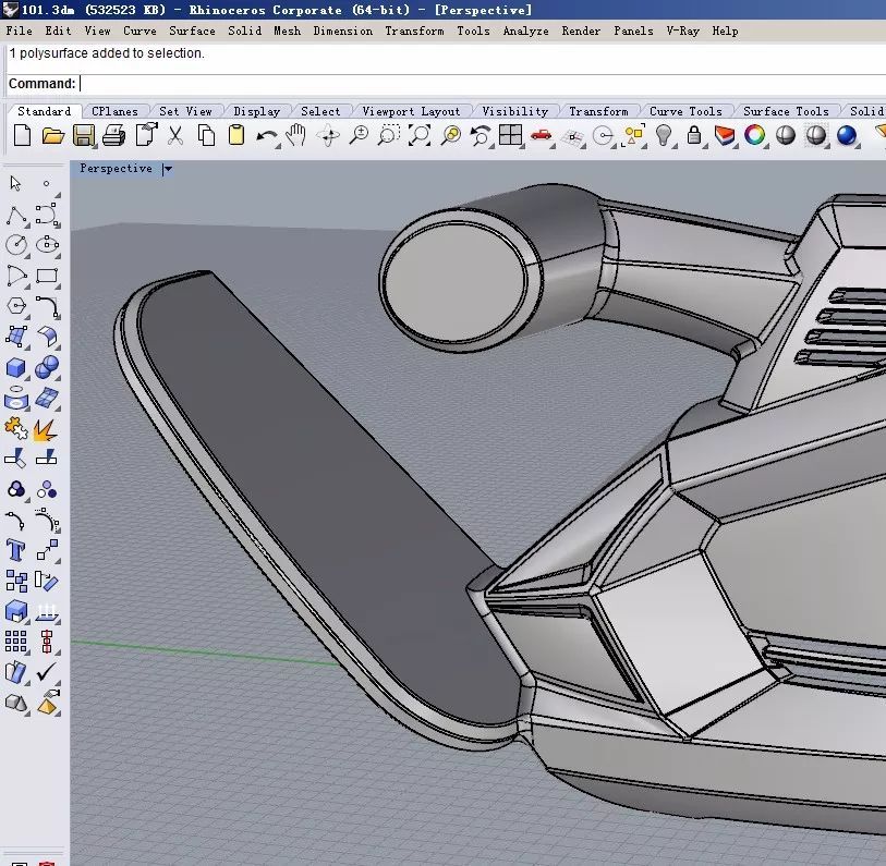 要修改的部分都完成了,接下去我们把护板和机壳连接在一起。先把护板剪开,删掉一侧。(护板其实造型也很复杂,这里不改了。)