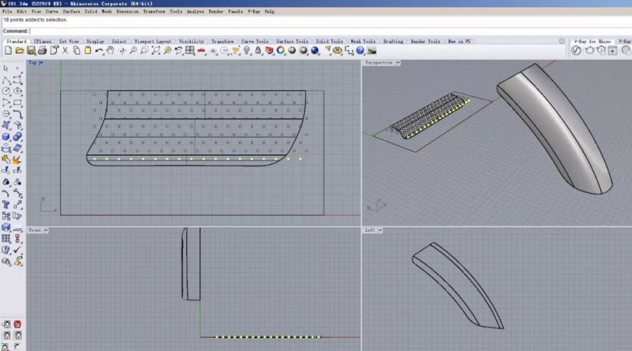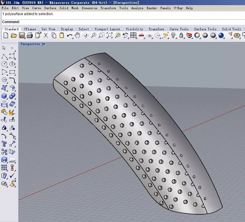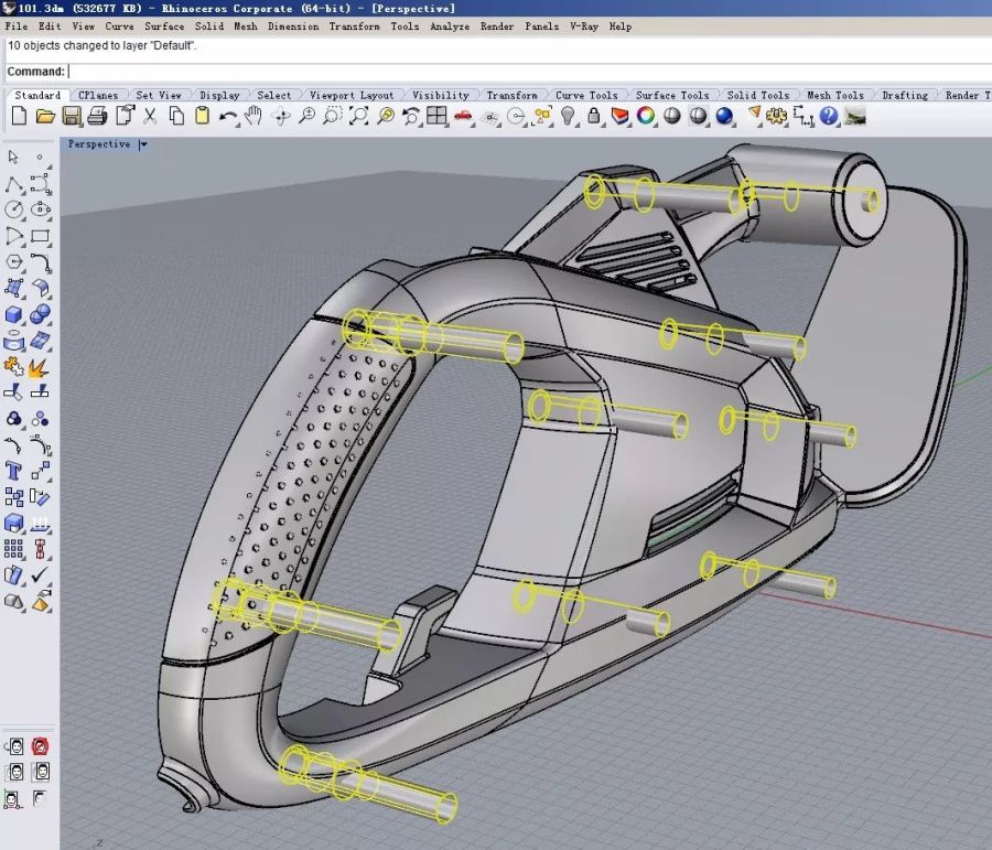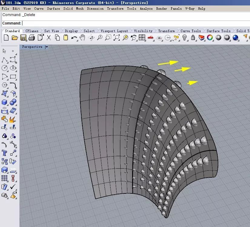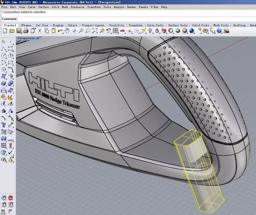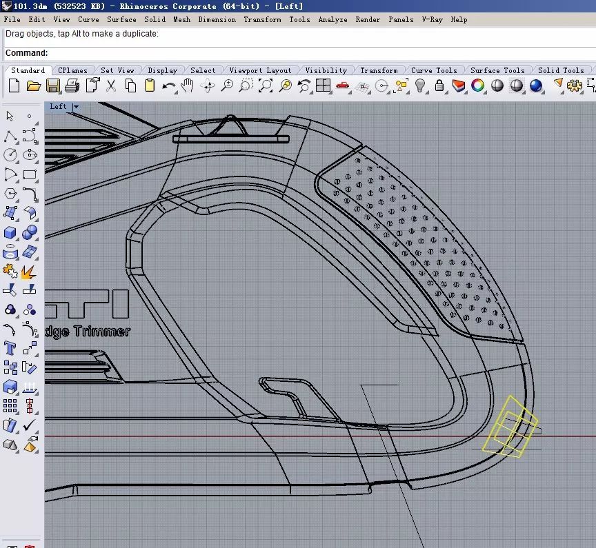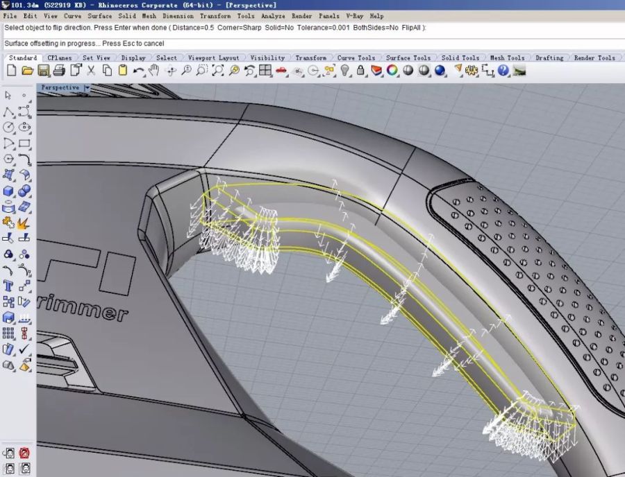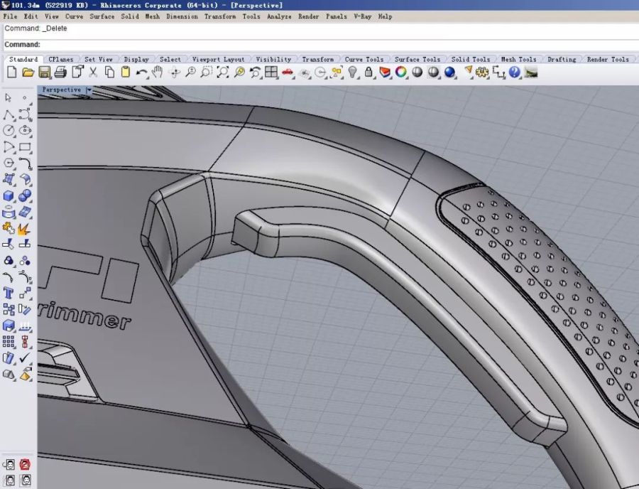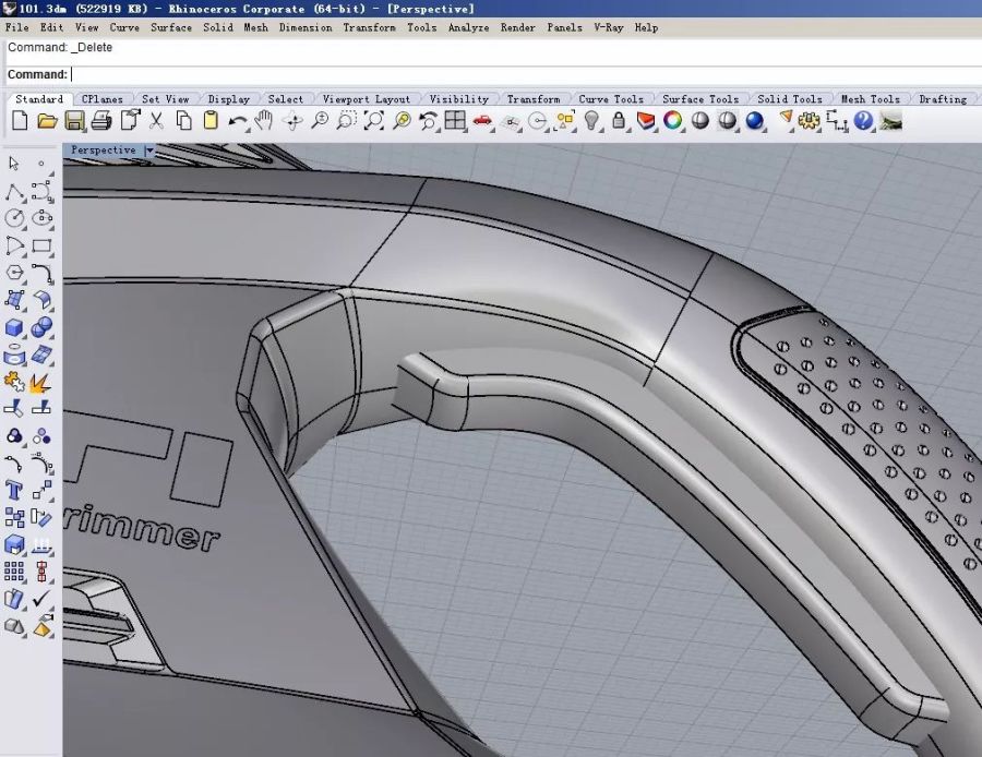 由于机壳是左右脱模的,所以在靠近把手背部的凹陷不能做的太深,否则无法脱模。所以要一排一排地依次把它们向外侧移动,直到不影响脱模的位置。再做布尔运算。