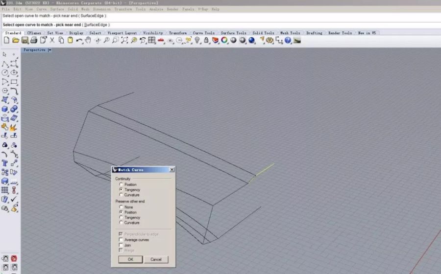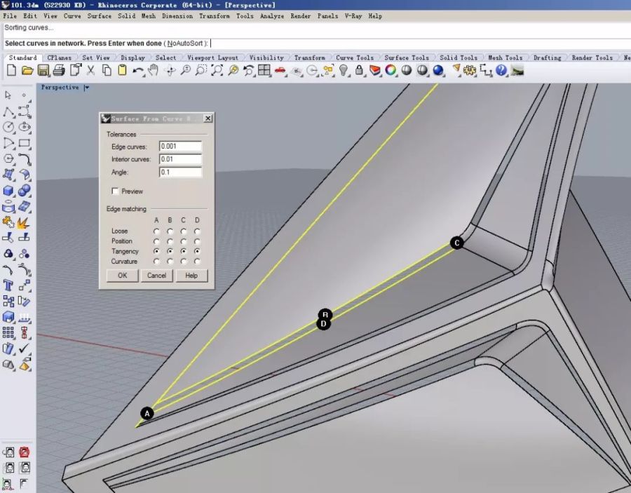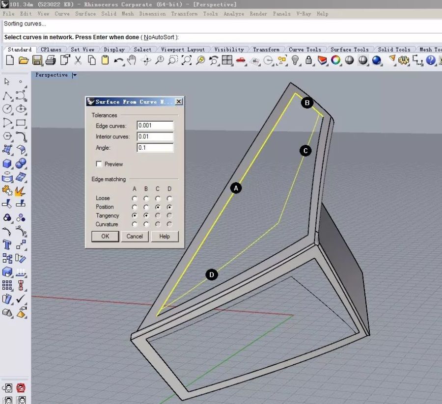 移动好之后,可以生成四边面,注意上图中,A和D两条边缘选择“相切”。