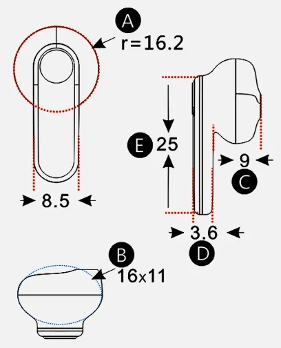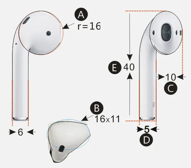 发现苹果Airpods的设计遵循了这个原则。(下图23 Airpods尺寸大小)。有5个重要尺寸满足人体工学。A:扁球的直径为16毫米。B:耳机外围曲线参照11毫米变化,变化幅度≤0.3毫米。C:杆子距离,决定耳机头触碰耳甲腔皮肤,从而感觉触觉,不是“悬空”的感受。D和E的长度决定了,在睡觉侧躺时,耳机触碰枕头伴随翻身,耳机会掉落的可能。