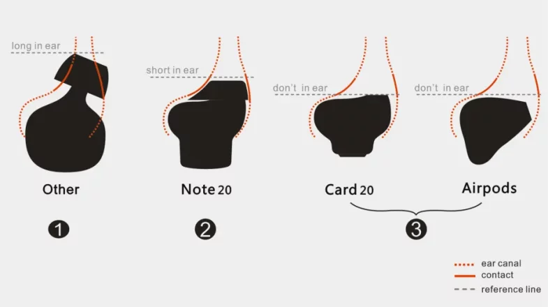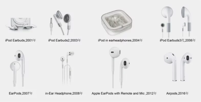 将目前TWS耳机在入耳深度上分为三类,(如图18-三类入耳深度)。1深入耳类:普通耳机前腔10毫米的入耳深度,密封性好,但是会导致耳道口的刺痛太大,会出现痒、疼、胀的感受,在阴虚质、痰湿质、湿热质、血瘀质人群感受更明显;2浅入耳类:前腔并不进入耳道,仅贴合耳道口,例如Note20耳机(note20人体工学创新),其硅胶帽在入耳深度和密封性之间取得平衡,通过小中大硅胶帽来实现入耳深度和密封性递增。3贴耳类:如Airpods耳机塑胶本体不进入耳道,凭借Φ13喇叭驱动力,声音传递入耳道,优点在于不碰击耳道口,缺点在于密封低音弱。如(图19,苹果耳机-贴耳式)看到苹果从2001-2017年推出的耳 机中大多数延续贴耳类发展。证明了贴耳的好处和尺寸的认可。