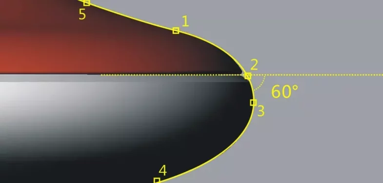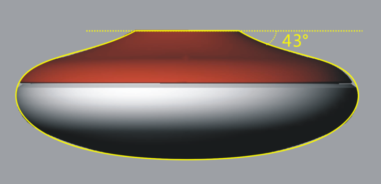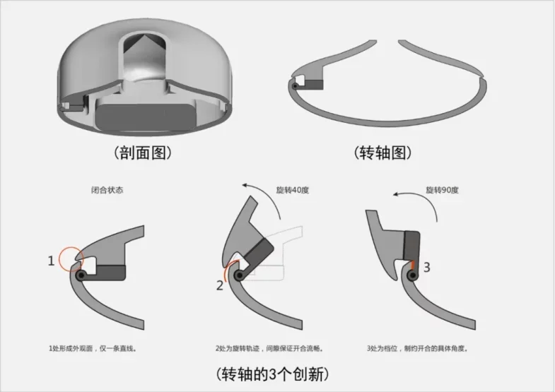 仅仅满足最小巧和超薄会丧失其他模块的考量,结合成本、产品魅力、用户感知价值来考量。匠心并不是时间和加法的堆砌,而是面对多个要素整合择优。以下示意了工业设计基于结构设计的再优化。1. 简化:转轴内置的为外观带来亮点,变得纯粹和简洁,一条线分割,外观无断点。2. 旋转距离,这个旋转距离。经过旋转之后,不会衔接上下盖的那个缝隙。如图10所示。3. 预留装配公差:底盖反包,上下盖的装配公差,大约在一毫米。4. 方便抛光:外观曲面设计,满足铝合金抛光,接近外鼓面方抛光打磨。5. 降低成本:铝合金硬度软和韧性无法充当转轴,且加工转轴成本较高。粉末冶金的硬度满足转轴高频率翻转,以螺丝固定。6. 曲线美化:(图14)在包住元器件的前提下,锁定风格区间,最佳是第二个。(图12)中,43度夹角满足抛光打磨。(图13)中,找到1-5个点和分模线夹角,这5个点要多次调整才能得到。