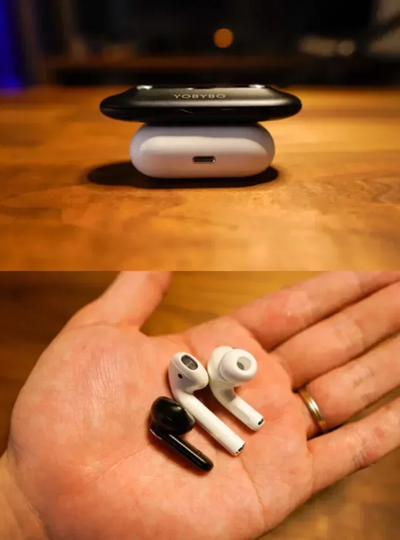 与苹果airpods相比厚度仅为一半,耳机更是小巧。对标品牌极具优越性。