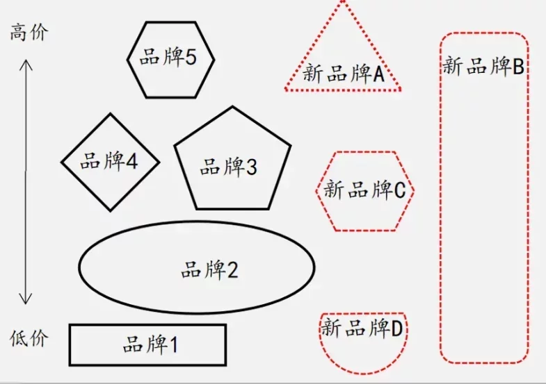 上图中2示意了,五个品牌在这个行业内分布情况,左边轴代表低价和高价,显示品牌价值定位,品牌1处于一个低价,品牌2中低端,品牌3和4是中端,品牌5于高端。这些品牌从高价和低价占据消费者的心智,另外每个品牌这个形状都是不同的,有圆形、方形、五边形、六边形,代表这个品牌的差异语言和产品感知。这是抽象模型示意,我们可以思考我们行业的现在和潜在机会。