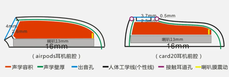 产品设计分为两个知识模块。其一尊重前人,遵循规律,不犯错。其二个性发挥,创意创造带来差异。首选要找到声学和人体工学和个性的关系,并取其精华去其糟粕,进而设计出新作品,如图25所示,对airpods耳机分析,红色区域为声学容积250mm³(立方毫米)。蓝色线为出音孔直径和容积,包括外出音孔面积和内壁出音口面积。绿色线为塑胶壁厚,0.8毫米均匀壁厚影响声音不外漏。黑色线为人体工学线,影响着佩戴舒适、接触耳软骨皮肤面积、产品形态个性差异,有3条关键曲线,并用空间点和尺寸进行约束。紫色线为接触耳道孔圆角,在苹果airpods耳机并未出现,导致入耳太尖锐有刺痛,而在card20的设计上注意此,圆角为1毫米,减少缓和入耳太尖锐刺痛。黄色线为喇叭振膜尺寸,根据喇叭高频振动行程来计算此条线的尺寸。
