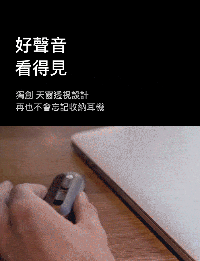 1/几何跑道图形,中间镂空设计,不仅可以观察耳机状态,更使得机身的厚度更薄,仅为12毫米为全球最薄。2/当口袋中装满手机、钱包、钥匙的时,此产品像一个薄“卡片”,最少占有口袋空间,轻松便携。3/全铝合金外壳包裹并赋予CNC加工成型,更是一张金属“名片”,对外展示精致生活和品质追求。4/金属转轴内置,完整的衔接上下盖,纯粹直线分割,线条美感无断点。5/“扁形”耳机戴进耳朵,没有任何压痛感,传递轻松自由佩戴。6/精密复合膜喇叭搭配降噪技术带来高清音质。