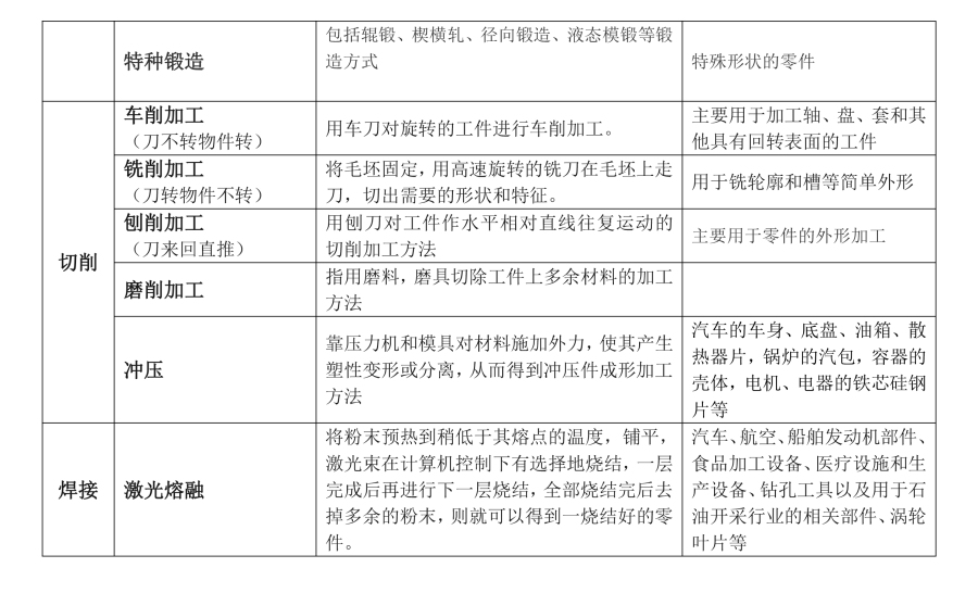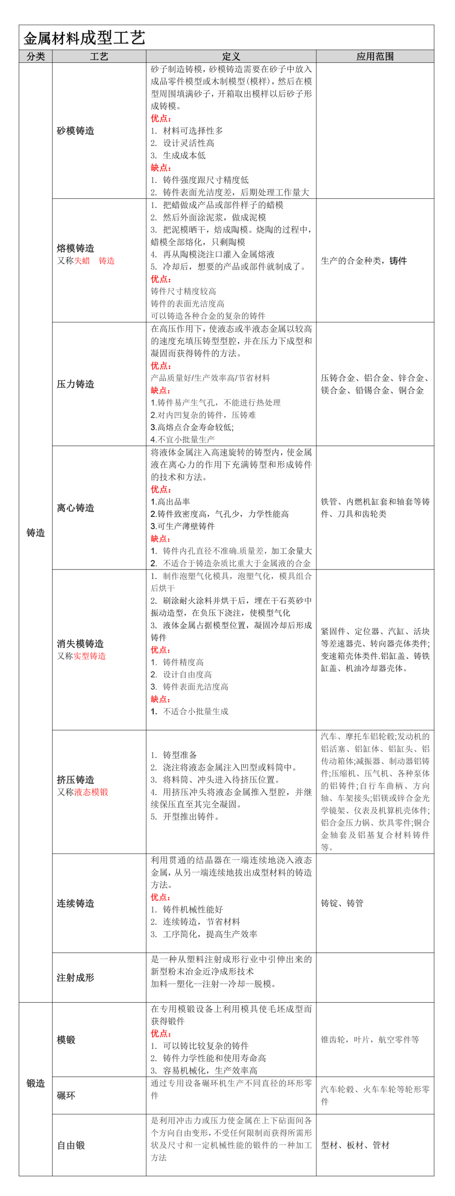 •常见的金属材料成型工艺主要分为以下几类:铸造、锻造、焊接和切削加工,如下图