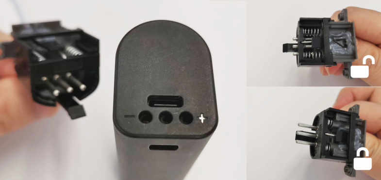 筋膜枪的电池包除了卡扣还得实现供电插针的插拔问题,弹簧松了出不来,弹簧紧了直接射飞