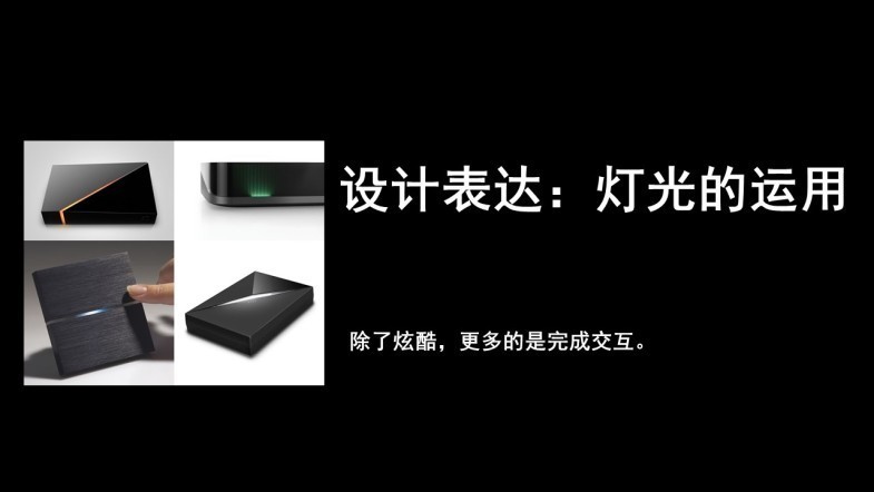 像这类产品的灯光,将灯光直射在产品表面,通过产品的表面的泛光来显示交互信息,有种出其不意的惊喜感。