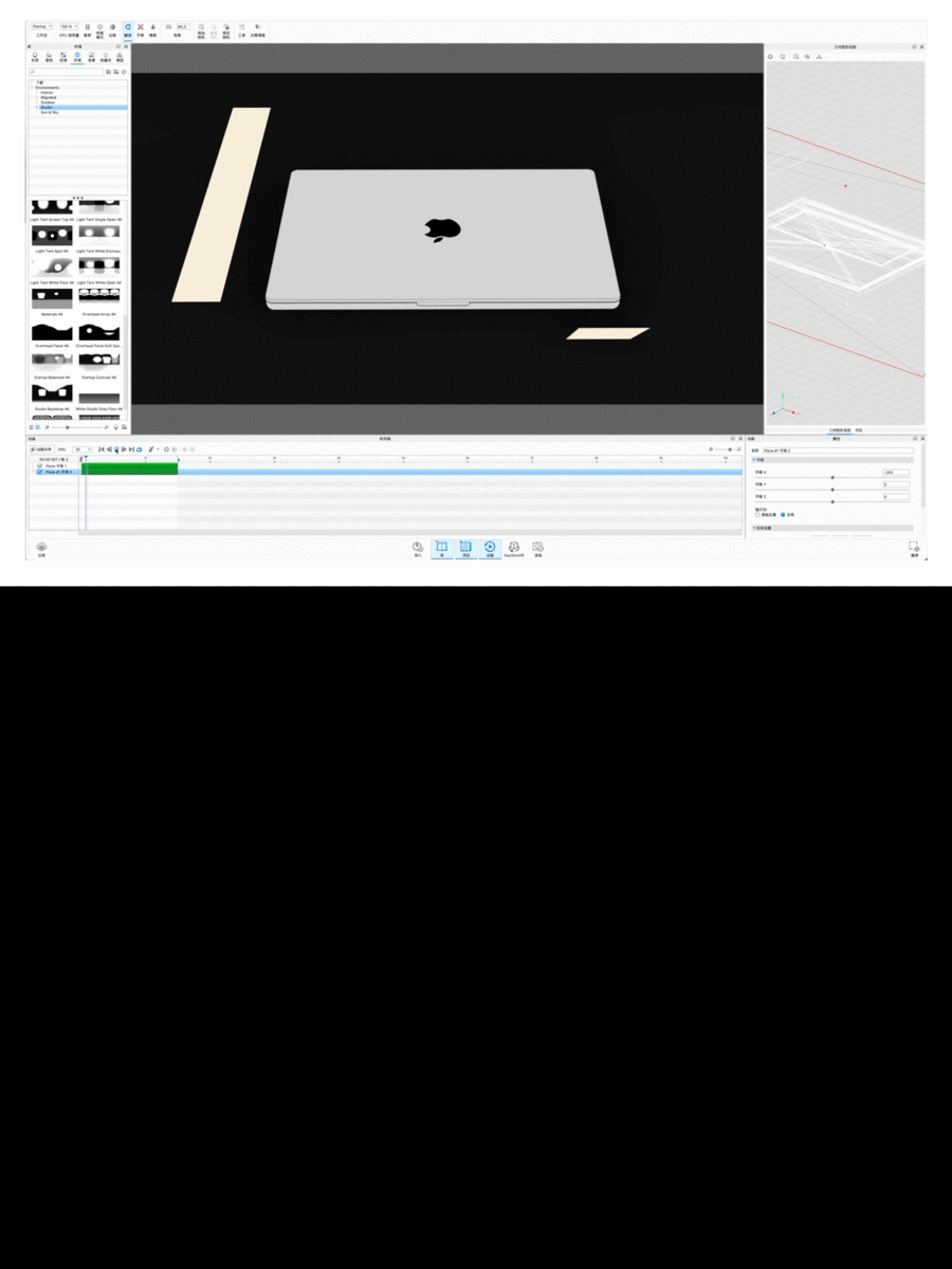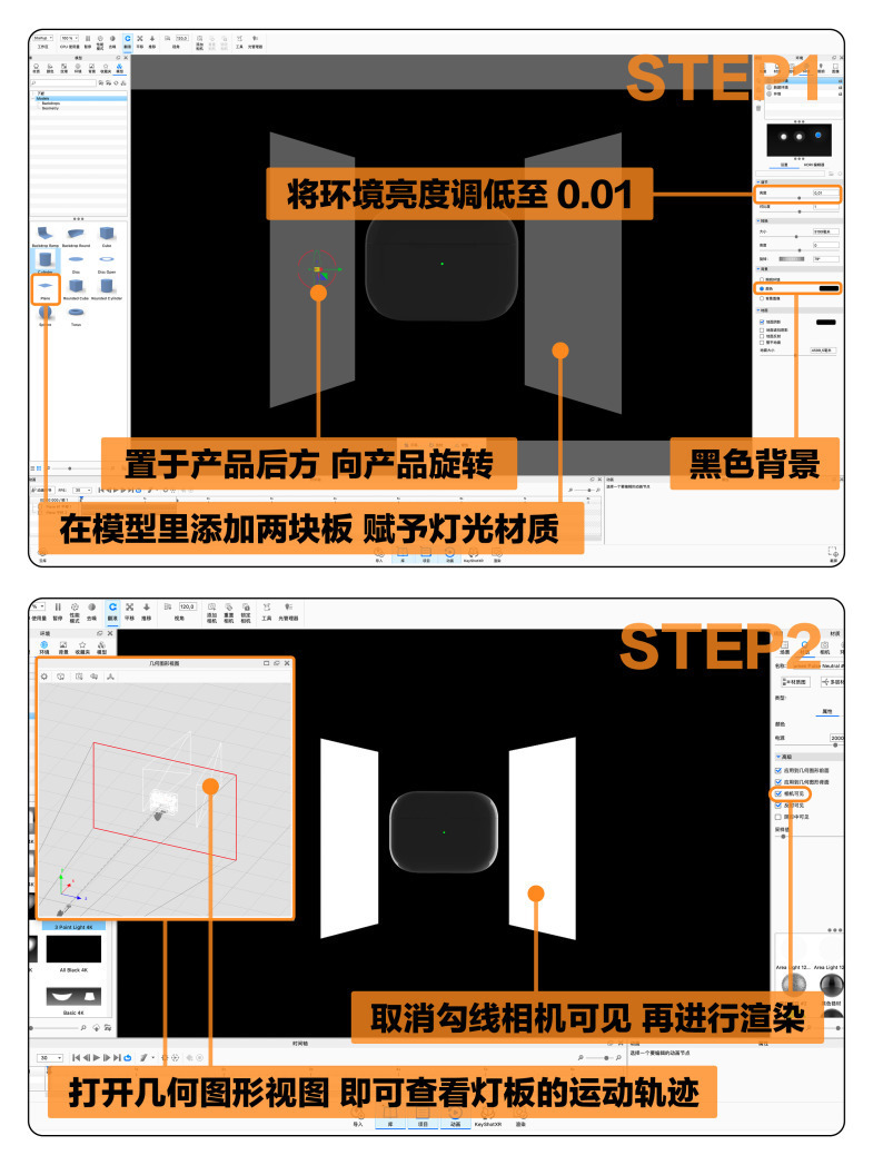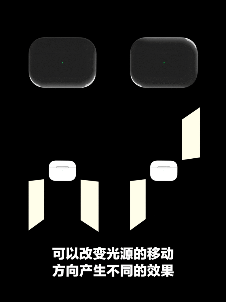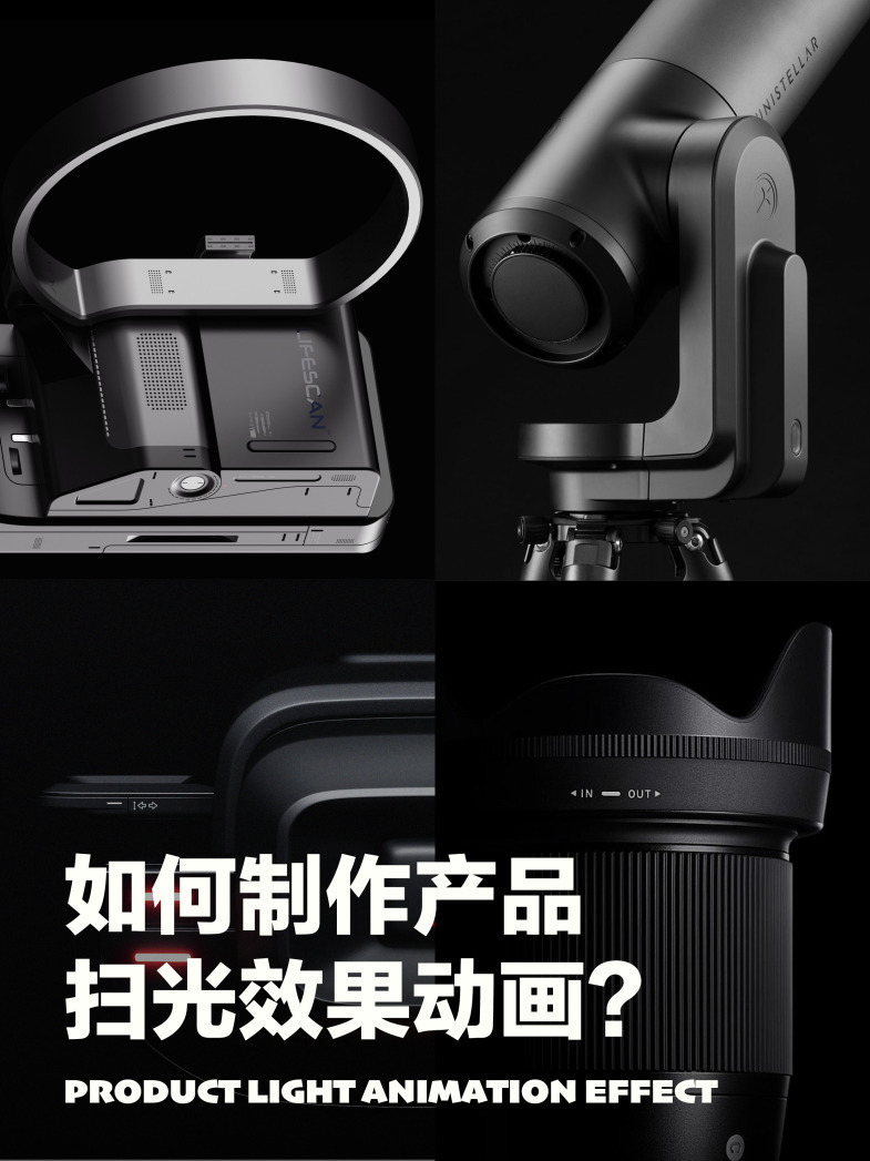🟠 首先是通过制作灯板来进行扫光,将环境亮度调低至0.01,选择黑色背景,在模型里添加两块板赋予灯光材质,置于产品的后方向产品旋转一定角度直到看到预览窗口里产品的边缘出现轮廓光。设置好灯板的运动路径之后取消勾选灯光材质里的相机可见即可。可以通过改变光源的移动路径来产生不同的扫光效果。