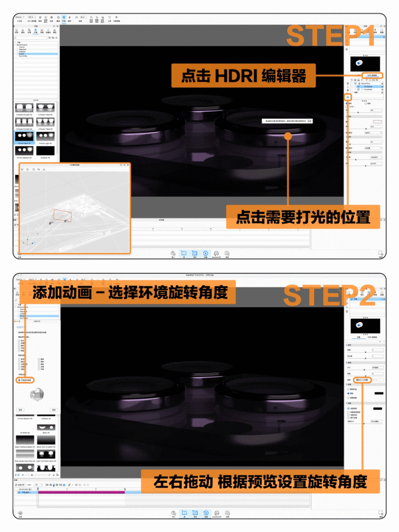 🟠 第二种是通过旋转HDRI环境来达到扫光的目的,打开HDRI编辑器,点击目标图标,再点击需要打光的位置,添加动画,选择环境旋转角度,左右拖动旋转条,根据预览来设置环境旋转角度的具体参数。当然可以结合相机运动,物件运动或通过剪辑在片段之间加入转场(如黑场过度或叠加溶解衔接别的画面)通过变速增强画面表现。