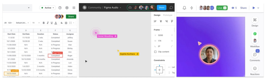生产力应用需要在文档中显示协作者,以便于让每个人都知道这个特定区域正在被编辑,他们可能需要避免同时编辑它。电子表格在用户所在的单元格周围有彩色边框,边框上有用户的姓名或首字母。当你跟随其他用户的视窗时,像Figma和Miro这样的Canvas应用实际上会以复杂的同步机制显示每个用户的光标。Pitch则更进了一步,它用一个直播视频和光标取代了虚拟形象。