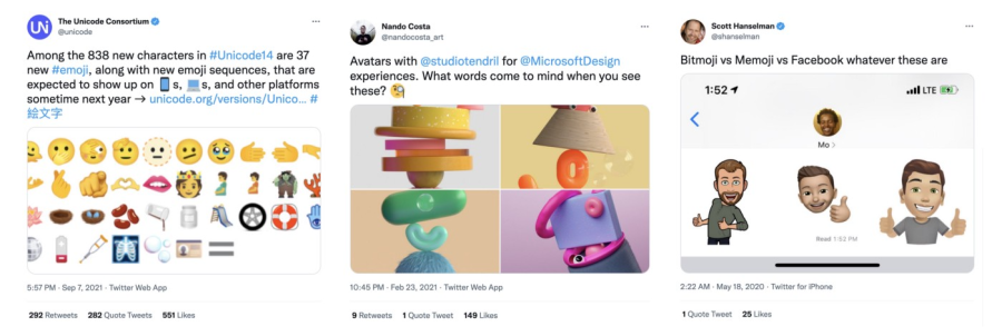 当然也有可定制的emoji,Snapchat的Bitmoji和iOS的Memoji。甚至,你可以通过这些可定制化身来塑造你的数字存在:给他们换衣服,穿上限量版的运动鞋,或者用录制一段memoji视频发给别人。