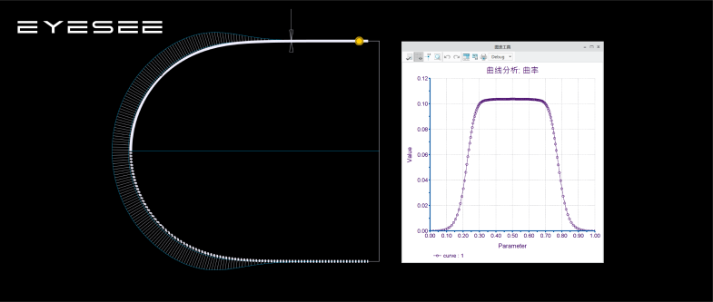打开曲率分析的图表工具,中间的曲率应该是平的,因为曲率是是半径的倒数,曲率图表是平 的就代表半径相同,也就是说明是一段圆弧;