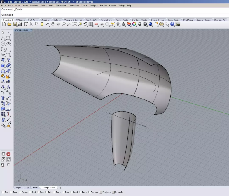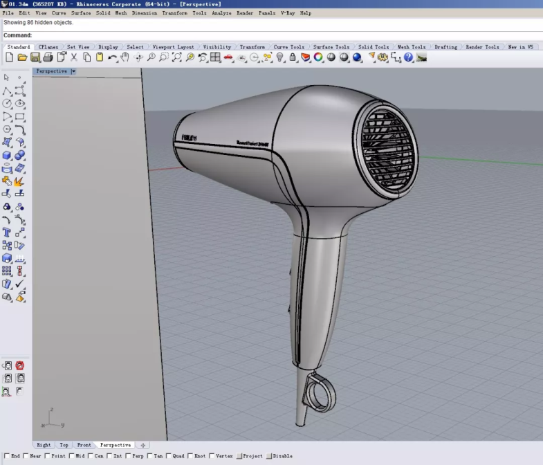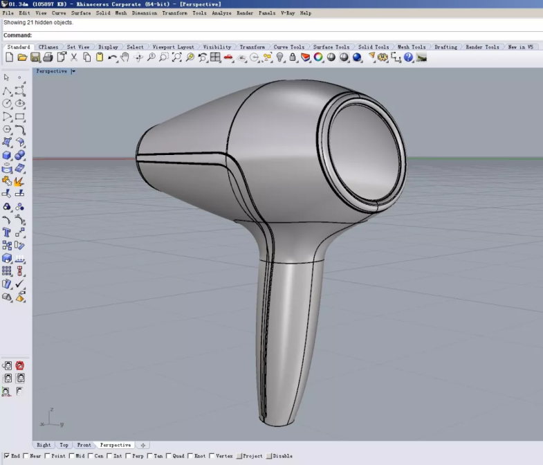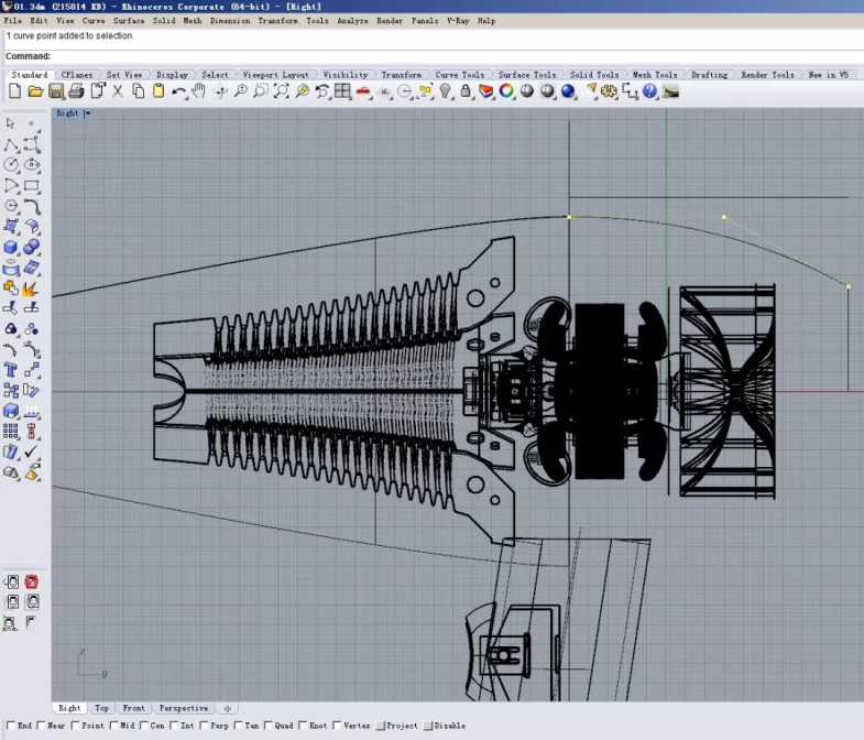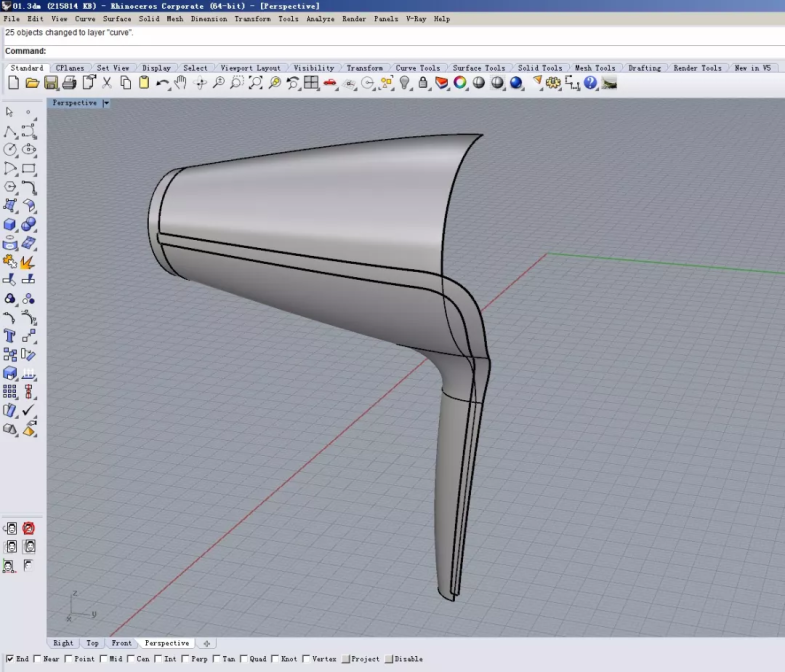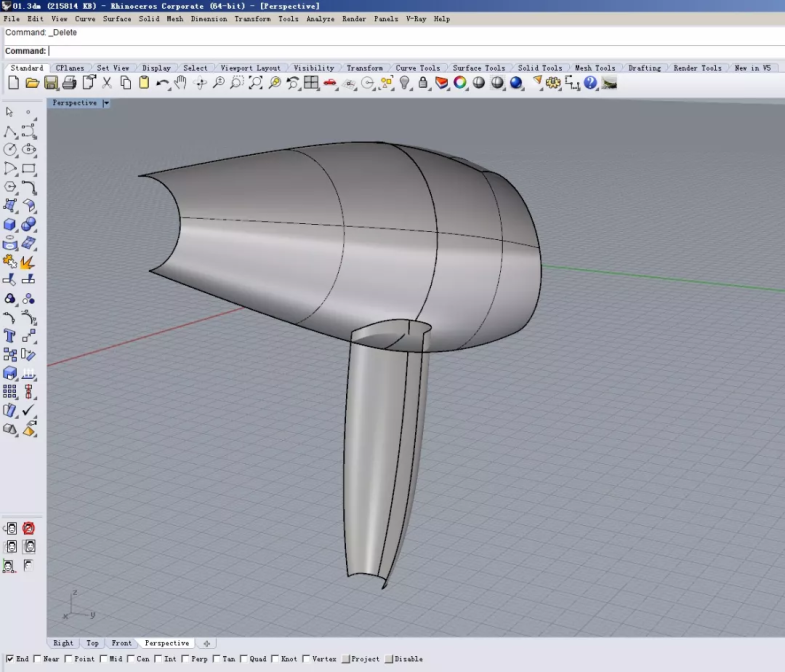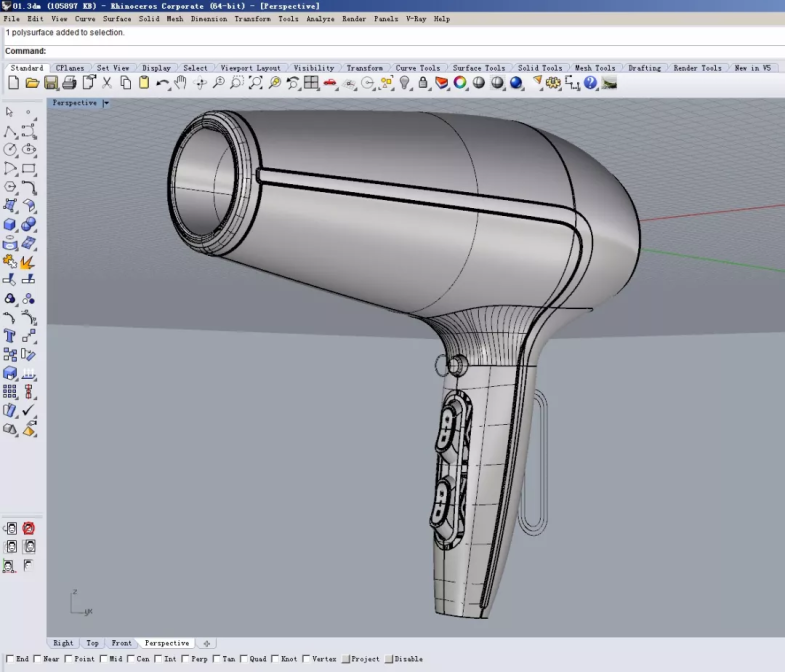 然后重新绘制风筒前壳部分的轮廓。只用三个控制点,让曲线呈现出自己想要的样子,同时与后壳的接缝处,要水平相切。