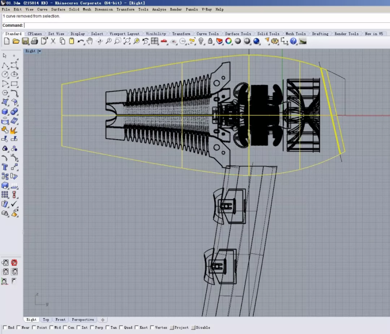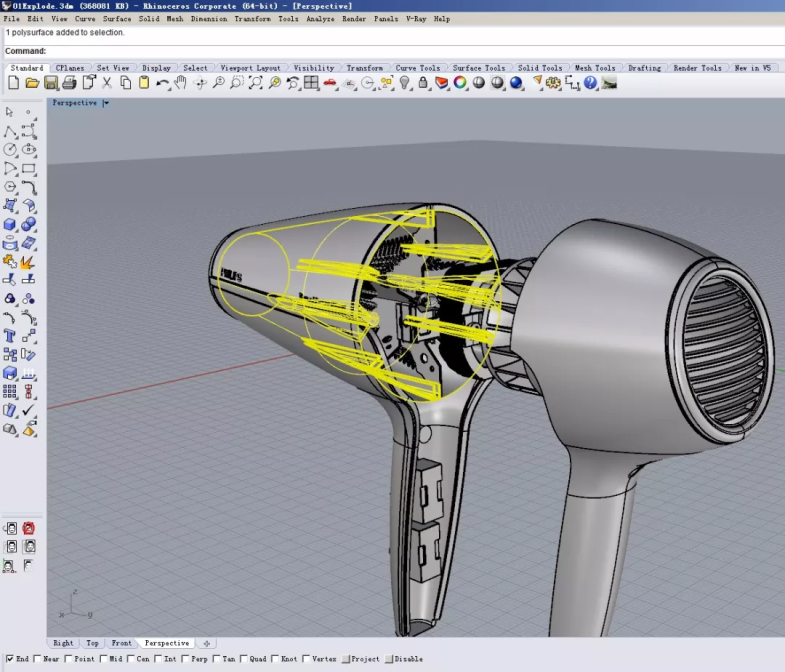 再次打开模型,在原有的基础形体上,我们要重建新的外观。首先要做的就是要延长风筒的前壳部分,就像之前手绘中的尝试。我直接利用单轴缩放延长了20mm。这样出风口大小不会变化。