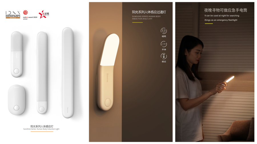 03.开窍:入职产品公司后一个偶然的契机,当时对接需求的一个产品经理需要优化设计一款灯,拿了几个工厂的初版样品给我和另一个设计师一起比稿设计,其实样品的创新功能已经验证好了,但由于公司要求要有自己独立的外观设计,所以这个案子产品经理没有在功能上提新定义需求只要新的外观设计,我拿到样品的时候外观已经设计得很极致了,主要是市场那几年比较流行小米风的极简设计,所以导致我有点无从下手,由于在产品公司开始慢慢受到产品思维的影响,我开始抵触纯外观直觉的设计,当时公司对设计思考的时间和创新尝试还是很宽容的,所以我有一定充裕思考时间,那我想既然不再想外观直觉的盲画,能不能从用户角度出发尝试挖掘一下用户的痛点转化需求来自洽设计的合理性。然后自己做了一轮市场调查,发现用户在使用市场同类壁挂小夜灯的习惯是有高频的移动需求,比如夜起厕所/喝水/喂奶/检查小孩睡觉情况等,但又不希望有强光照明或者室内开灯刺眼,而市场的磁吸壁挂小夜灯只考虑壁挂装配的固定合理性,未能很好的满足用户起夜移动高频习惯的方便性和灵活,基于这个作为切入点,重新通过造型和结构设计的优化,提出了一款“可移动式的壁挂小夜灯”的概念设计方案,通过磁吸式简易拆装结构,既能为用户起夜感应照明,同时又能充当手电筒提供移动照明,在没有增加新成本的前提下,通过外观设计的创新满足了用户低光照明的移动需求,给产品带来新的价值和差异化卖点,提升这款产品功能上竞争力优势。最后在比稿提案被选中成为当年公司畅销品,同时这个系列的产品还拿到了20年红点/IDEA/红星几项设计奖。