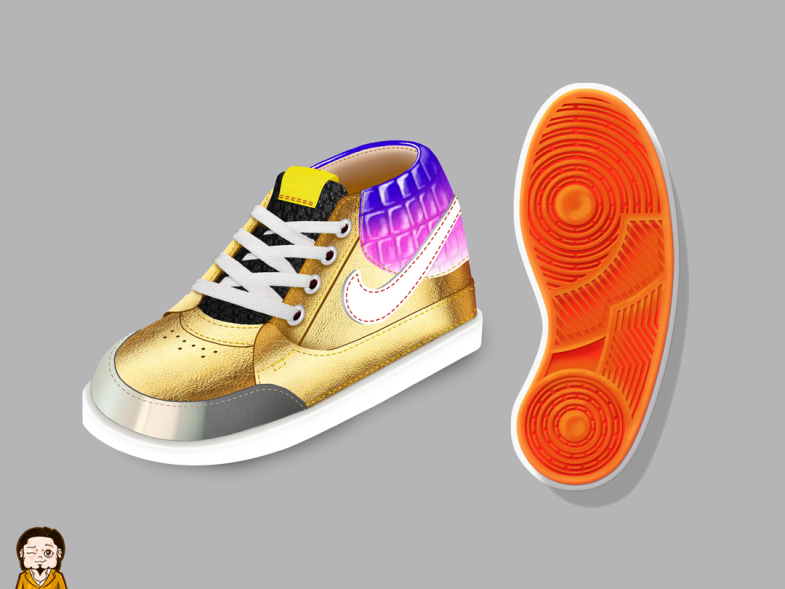 参考钩子鞋的设计模式设计的鞋子及鞋底。鞋后跟添加了鳄鱼皮的元素,渐变的紫搭配奢靡的金;原创纹理的鞋底,采用诱人的橙红色。