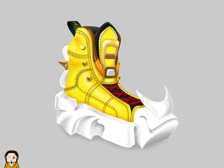 第一波的开始图,以金蟒为灵感的一系列设计中的一个。黄黑配色这次加入了红色鞋带,增添了一些凶气,更符合“蟒”的立意;明确并新添了黄铜五金,增加贵气和质感;重新梳理了结构,看起来更合理。