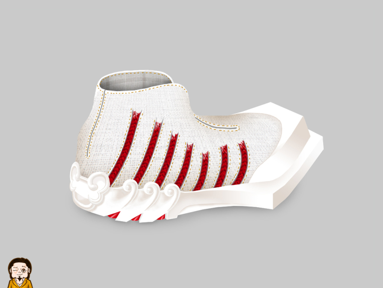 国潮官靴:方头宽底,白云鸿运。鞋跟部分饰以祥云及如意图案,取意:连升如意。造型与意境完美融合,颇具中国传统文化内核。