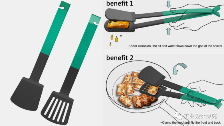 作品 2,名称是:一种可以组合的锅铲设计。一句话描述:锅铲的尾部设计了缝隙,仅需将两者合起来变成为一个夹子,这样夹豆腐 油会顺着下面的孔隙流出,同时也可以翻转油炸食物。如图 8。