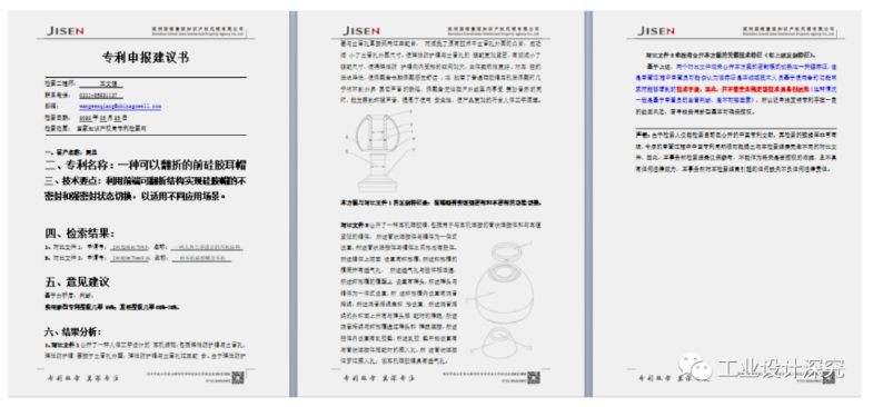 上一个环节输出设计文档后,接下来代理公司会输出《专利申报建议书》,包含 1.检索报告。2.甲乙双方明确专利名称:一种可以翻折的前硅胶耳帽。3.技术要点:一句话形容创 意概念。4.检索结果对比文件,这里尤为重要,有时你申请专利时不小心却侵权了。做到专利不侵犯别人专利,这里尤为重要避免没必要的知识产权纠纷。5.建议:是申请实用新型 还是发明,或者同步申请,并澄清授权率多少。具体详见图 11,文末可以下载 PPT。