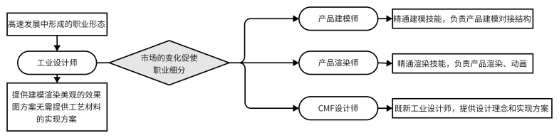 在过去这20年间工业设计出现了迅猛的发展,正因社会发展需要的是制造而非创造,提供创造能力的工业设计反而未能创造价值,而转变成了为制造业服务的建模师与渲染师,这是一场工业设计职业细化的变局。在这种大环境下,工业设计细分出了多两种职业,产品建模师和产品渲染师,去适用当下社会发展的形势。虽然,在现今社会上还没普遍出现这种职业名称,但是从工作内容就说明了其职业性质了。而这两种职业的诞生是从工业设计师中分支出来,当下大家也没意识到他们之间的区别,所以才有这么多挣议和对工业设计师片面的理解。我们身边所有事物都不是一成不变的,工业设计更不会例外,时代在进步行业职业也在发展,要学会用发展的眼光看问题。