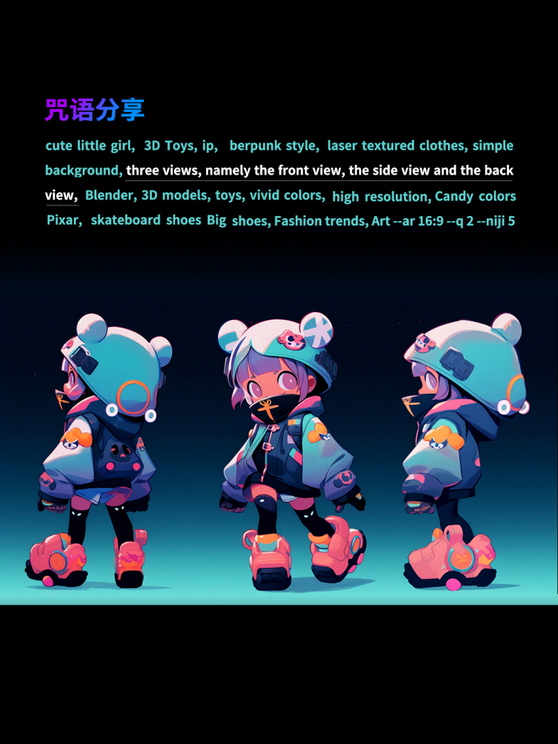 cute little girl, 3D Toys, ip, berpunk style, laser textured clothes, simple background, three views, namely the front view, the side view and the back view, Blender, 3D models, toys, vivid colors, high resolution, Candy colors, Pixar, skateboard shoes Big shoes, Fashion trends, Art - ar 16:9 -q2 -niji 5