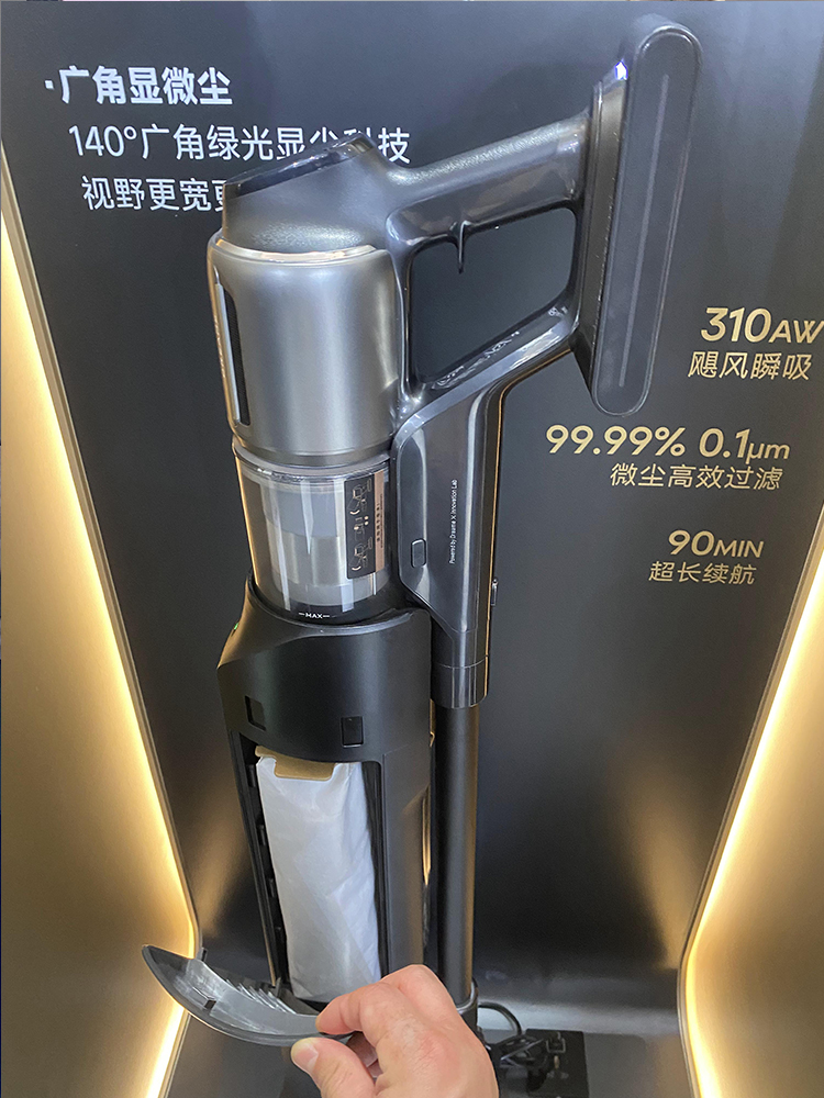 当然也有从创新逻辑上值得再思考的设计,比如气旋分离手持吸尘器是戴森研究多年从传统集尘袋吸尘器迭代进化而来,但这次展会上出现了基站内嵌集尘袋的设计,虽然这一定程度上可以优化清理集尘筒体验,却并不能完全替代这个手动动作,因为清理集尘筒内部依然需要手动操作。作为一个革集尘袋的命而来的产品原型,现在又特意设计一个内置集尘袋的基站搭配使用,很有讽刺意味,也许重新去思考如何升级传统典型吸尘器产品来解决这个诉求更为合理。