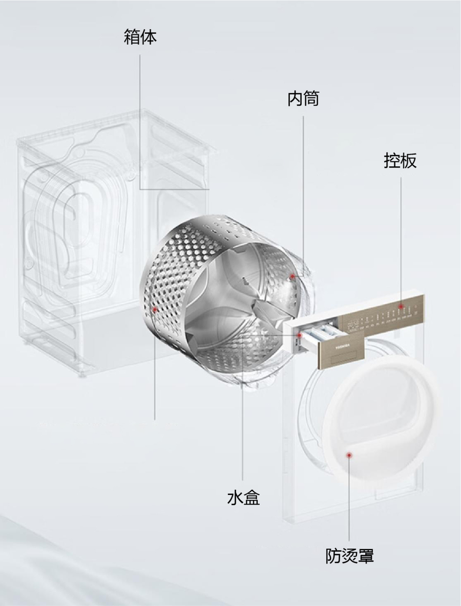 材质,通用且标准,行业早已洗刷那些不满足于基本性能要求的内容。能用之后要好看,好看之后要好用,好用之后是更高的产品诉求和行业标准。东芝T27洗烘套装各个部分皆是以上阐述的具象表现: