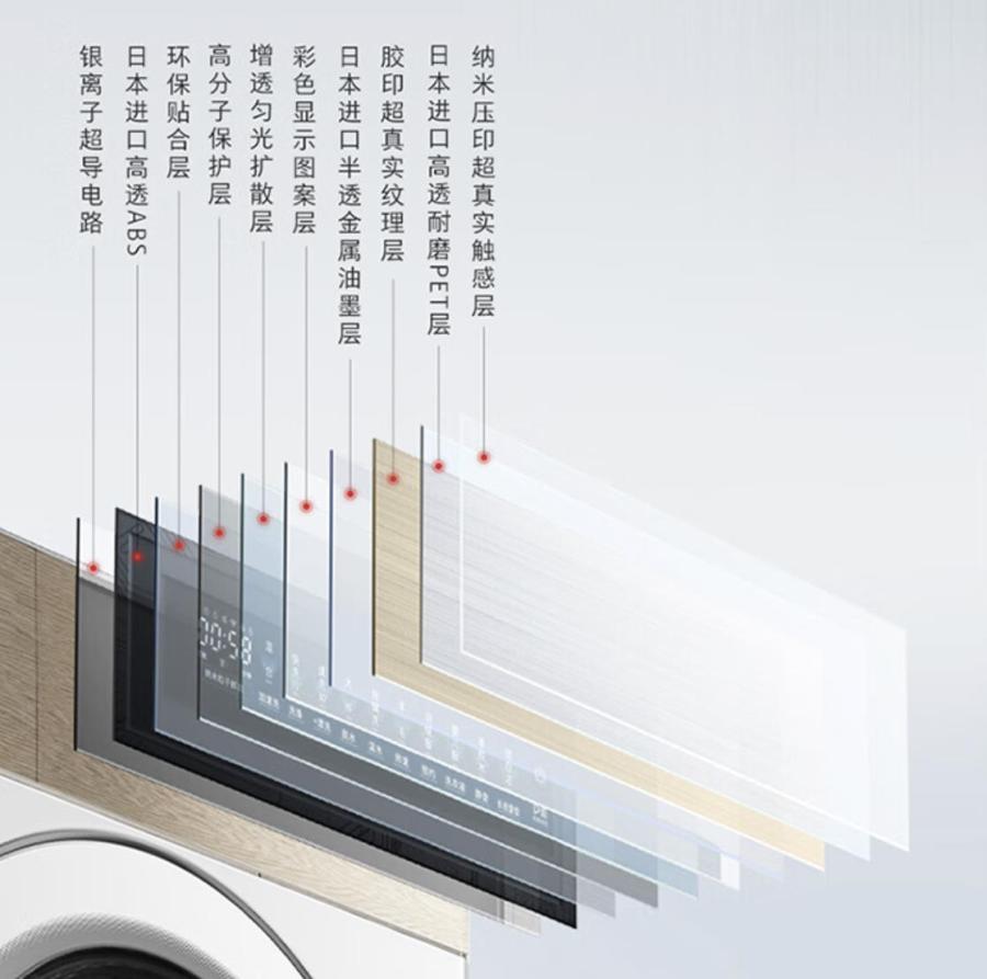 箱体:镀锌板,优异的耐候性、成本价值以及加工优势成为洗衣机量产开发的主要材料。在多样的家居环境中更耐用,是外观历久弥新的基础保障,亦是产品长久生命线的材质表达。触控面板:透明ABS材质,A使其耐化学腐蚀、耐热,并有一定的表面硬度,B使其具有高弹性和韧性,S使其具有加工热塑性并改善电性能。因此ABS是一种综合性能良好,价格便宜,用途广泛的材料。相比来看更能满足基础使用和更高的综合要求。内筒:不锈钢材质一定是当下洗烘套装最优的选择,复杂的液态环境、高速的旋转摩擦都因其高强度、耐热好、抗氧化、耐腐蚀、易加工特性被满足,具有光滑卫生、长久耐用、脱水高效、对衣物磨损小的诸多好处。防烫罩:玻璃性能优异,材质透明度高。洗衣机的发明起初并没有得到用户的认可,惧怕大型机械设备的“陌生”充斥着人们的情绪感受,也怕好好的衣物被吞噬破坏。那好吧,给你开个窗,看着怎么洗可以了吧……渐渐的透明视窗被保留,时不时观察洗衣过程,成为用户产品体验的方式之一。相比ABS塑料材质,玻璃更耐高温且不易变形,表面效果也更为丰富。随着市场要求的提高,可能要求更好的光学性能、更高的视觉效果满足同质化市场的差异化内容。水盒:PP材质,耐化学稳定性好,耐腐蚀,且尺寸稳定性好、强度和刚性可满足基本使用。加工性能好,可以保护洗涤剂不受潮。对比ABS材质价格更低,可以达到降本增效的目的,可是被广泛使用的材质。CMF是色彩、材料、工艺的共融,工艺的表达是完美呈现色彩、材料的重要方式。换句话说:产品皮肤早已成为当下最赚钱的商业模式。丝印:丝印成为功能说明与细节表达的方式之一。主要体现在洗衣机的功能按键标识、模式指示、温度、转速等文字和符号上,水盒和门圈也常有提示。丝印作为基础工艺,很多设计师都见过实际的执行操作,往往制版阶段略有疑惑。制版阶段包含绷网和制版,绷网要清洁网框、固定丝网、保证张力均匀且稳定,丝网方向亦是决定印刷质量的重要内容,制版通常需要涂感光材料、贴合菲林片、并执行曝光,与冲洗照片一个原理,感兴趣的设计师可以网上查阅 ,当然更先进的激光制版也越来越普遍。IML:在控板上的应用非常广泛。表面是硬化的PET透明薄膜,中间印刷图案,背面与塑胶件结合,是最常用的表面装饰工艺。产品效果可长期保持不易退色。当然工艺的叠加是设计层次和丰富感受的方式,PET表面亦可呈现不同的视觉效果和触觉感受,并具备防指纹、防油污的特性。