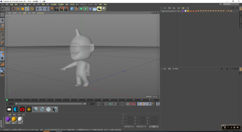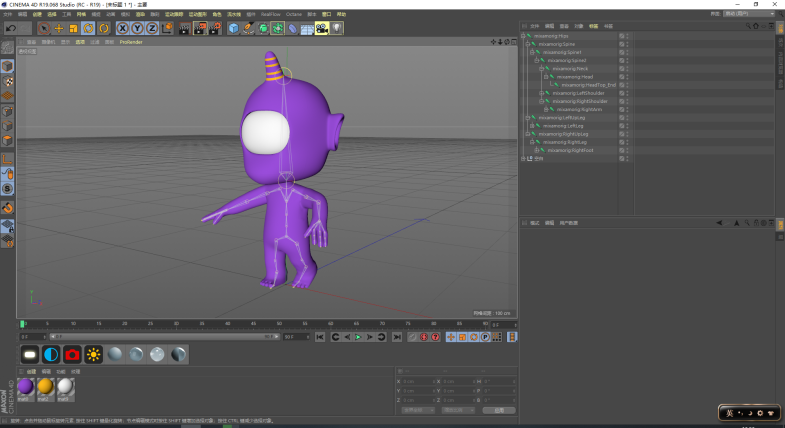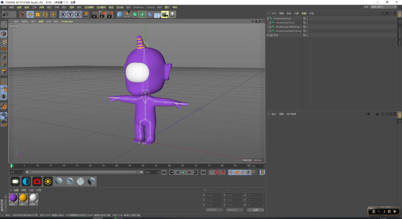 在C4D中打开刚才保存的文件,这时可以看到右上角有绿色标志,表示模型已有骨骼了,并且模型的身上也可以看到。(这时先保存一个OBJ格式的文件,在后面穿衣服的时候需要用到!)