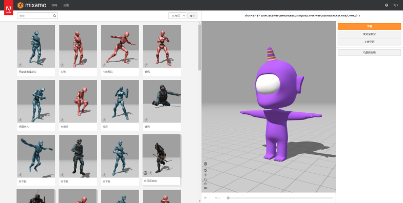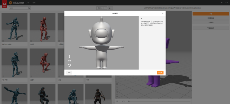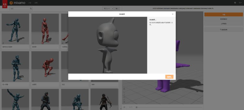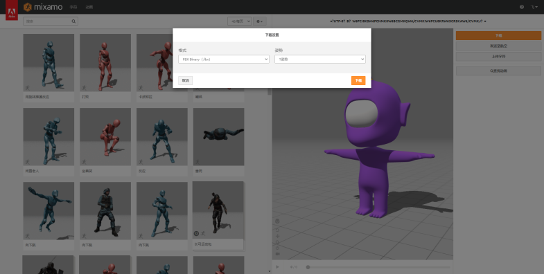 绑定成功后,可以在网站里面选择喜欢的动作保存出来做动画,但是我们这里只喜欢保存已经绑定骨骼成功的模型,点击右上角的橙色下载按钮保存FBX格式文件。(下面的图片我开始使用之前绑定好的模型图片,流程和方法还是不变的哦,网站绑定的缺点就是太慢了 )