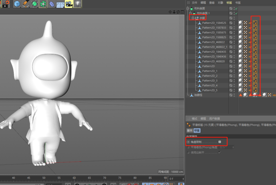 然后点击模拟-布料-布料曲面添加,然后按住ctrl将布料曲面往下拉复制多一个,然后将其中一个如图二摆放。然后点击下面那个曲面布料,将细分数调为0,厚度可以适当调整。然后点开衣服全选最右边的橙色平滑标签,将他们的角度限制勾选给去掉。这一步是为了让衣服的整体和边缘更加圆滑。