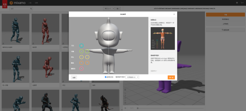 然后按照提示将对应的骨骼放到模型上,然后点击右下角的下一个即可完成绑定。